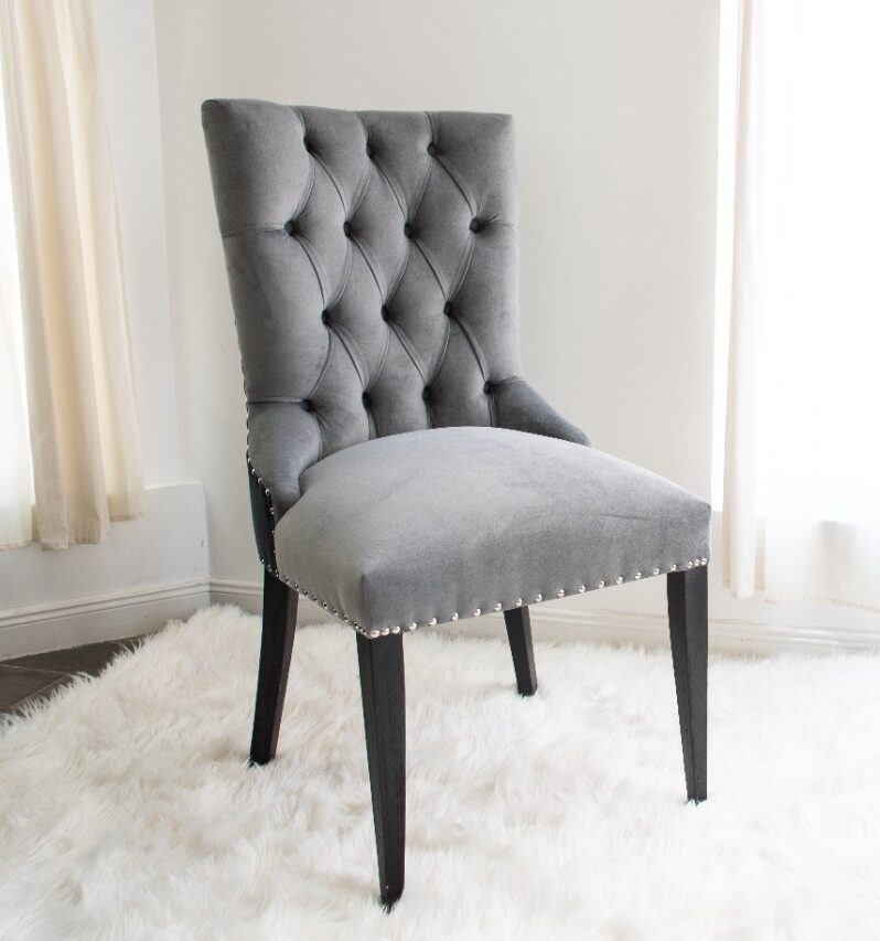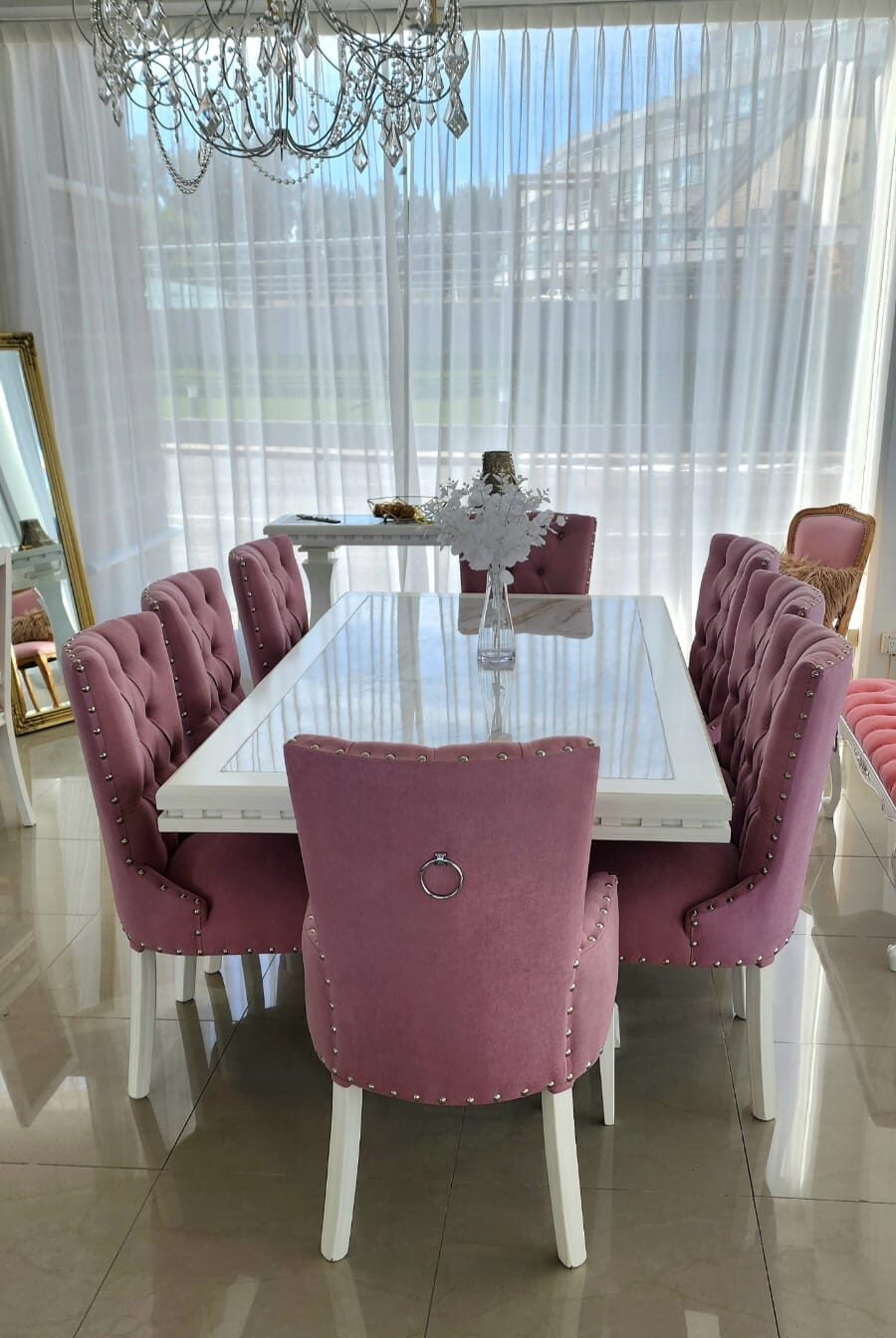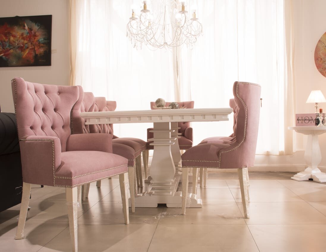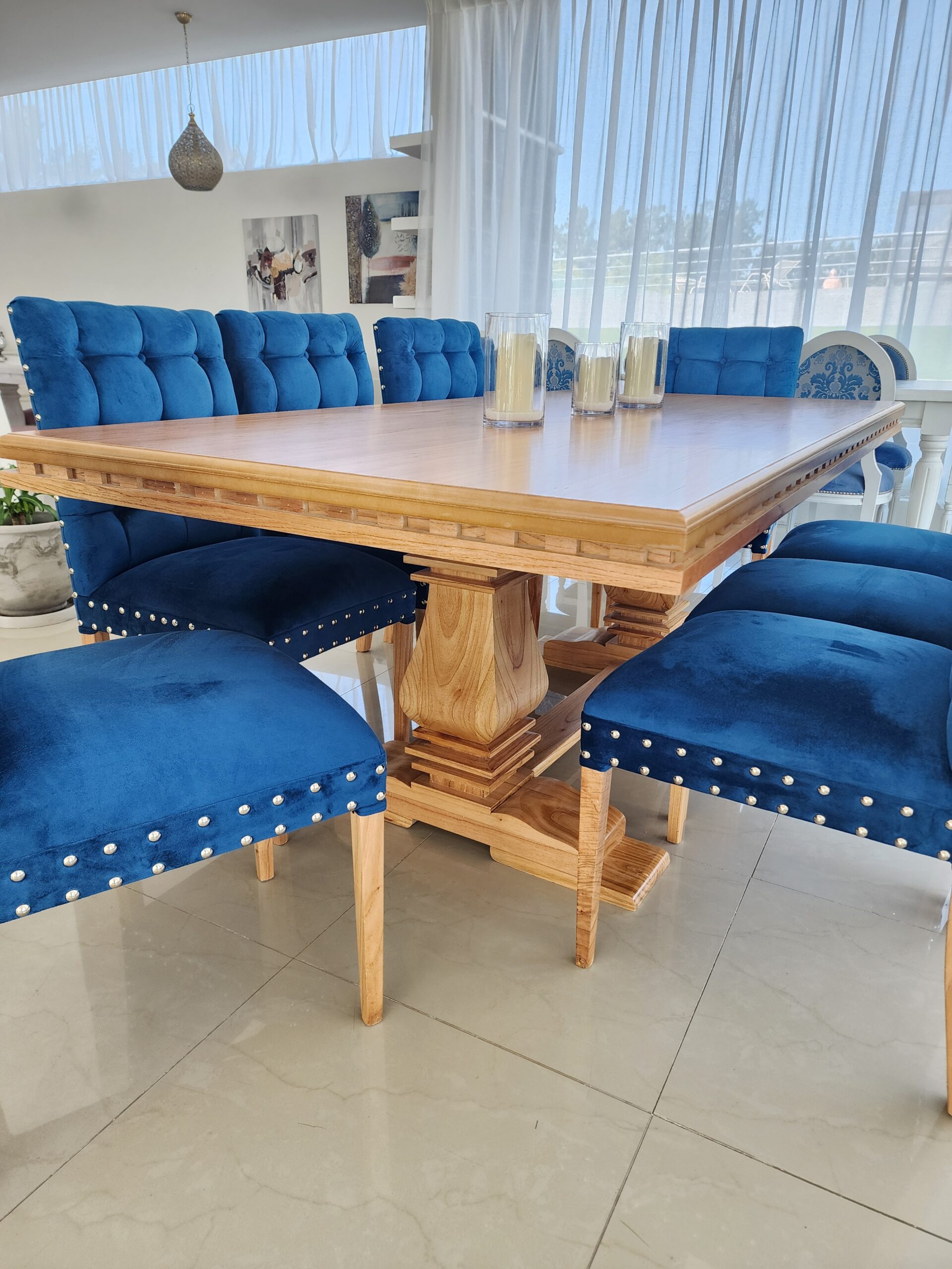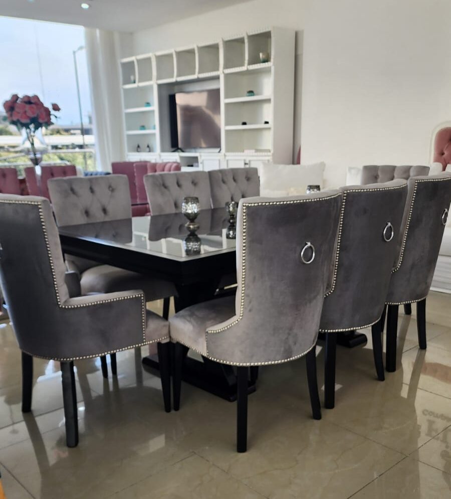 con 6 sillas curvas mas 2 cabeceros con apola brazos, combinados en 2 tonos de grises.