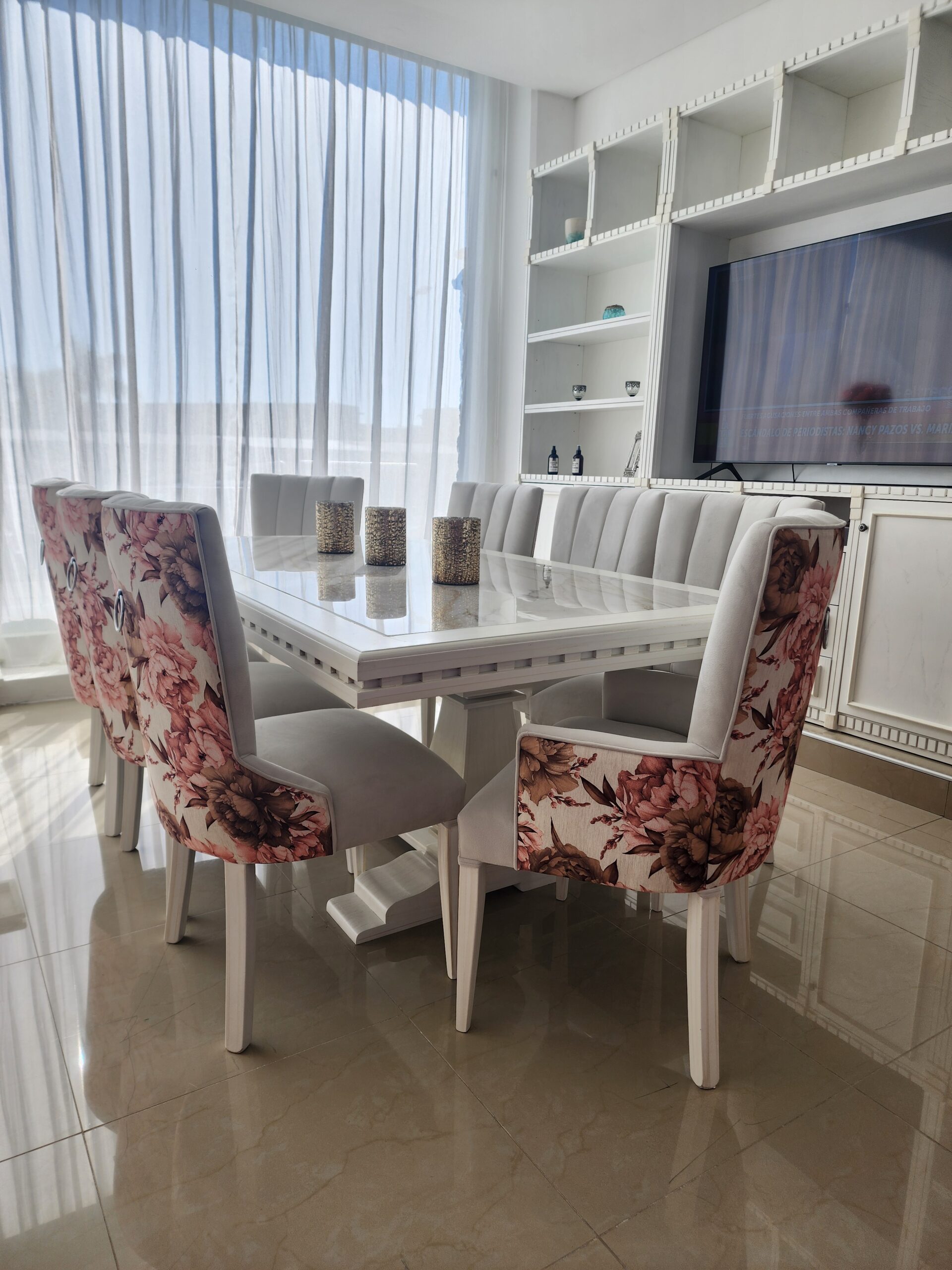 con 6 sillas curvas mas 2 cabeceros con apola brazos, combinados en 2 tonos de grises.